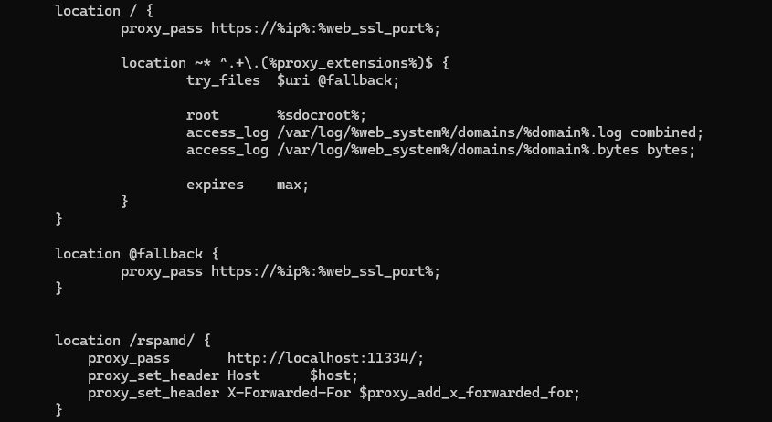 cp /usr/local/hestia/data/templates/web/nginx/default.tpl /usr/local/hestia/data/templates/web/nginx/rspamd.tplcp /usr/local/hestia/data/templates/web/nginx/default.stpl /usr/local/hestia/data/templates/web/nginx/rspamd.stpl - W tym szablonie dodaję odnośnik wczytujący nam RSPAMD po /rspamd/ pod location @fallback:
